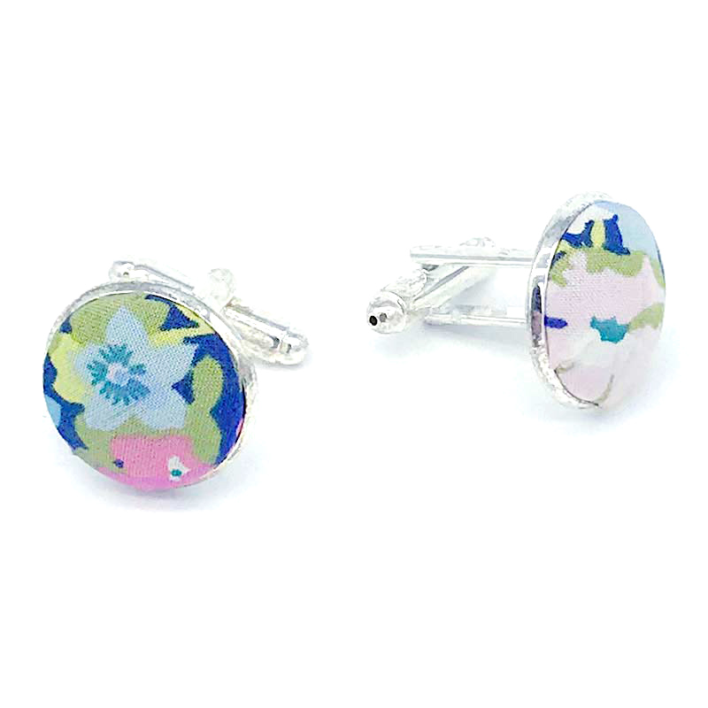Boutons de manchette habillés de tissu en métal argenté inoxydable à ouverture mécanique.